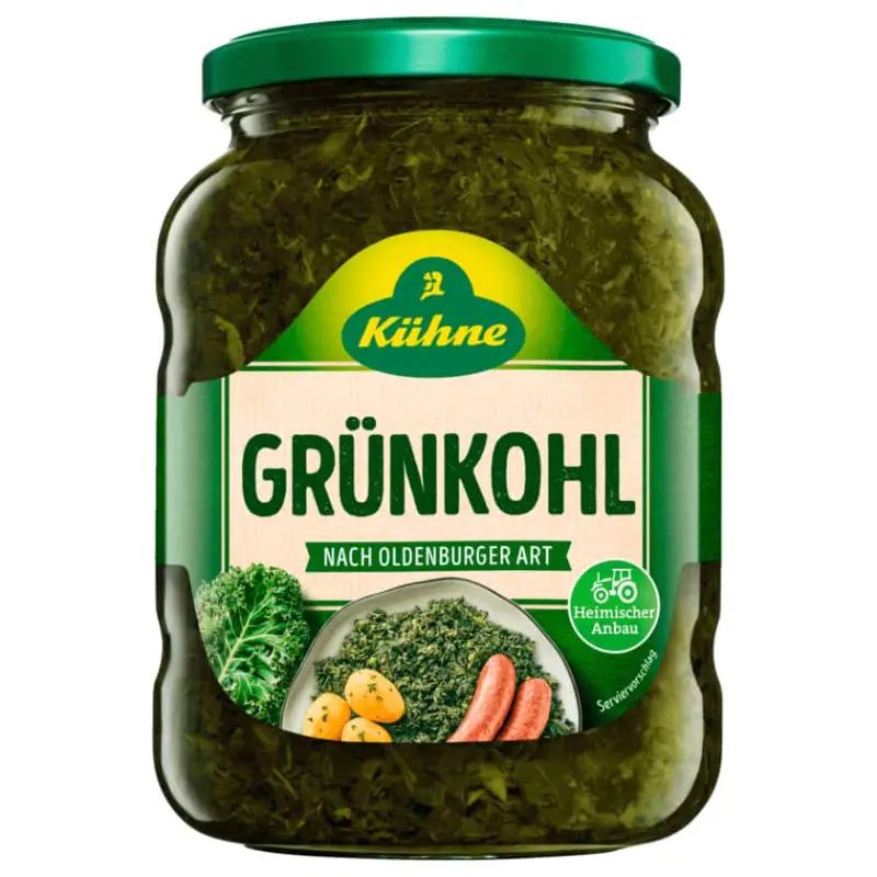 Bestellen Sie jetzt Kühne Grünkohl Oldenburger Art und erleben Sie authentischen norddeutschen Geschmack im praktischen 660g Glas!
